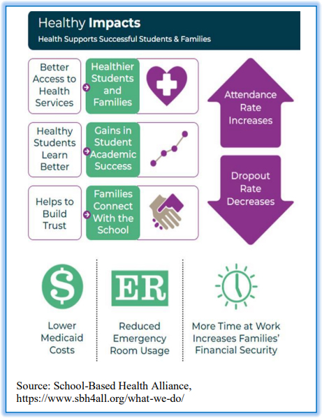 A United States Department of Health and Human Services study indicates that teens are more comfortable accessing health-based services through school-based clinics in one location. The benefits of such clinics in schools serve to help build social skills, leadership, self-awareness, and caring connections to adults and the school community. These centers also improve truancy and disciplinary problems.