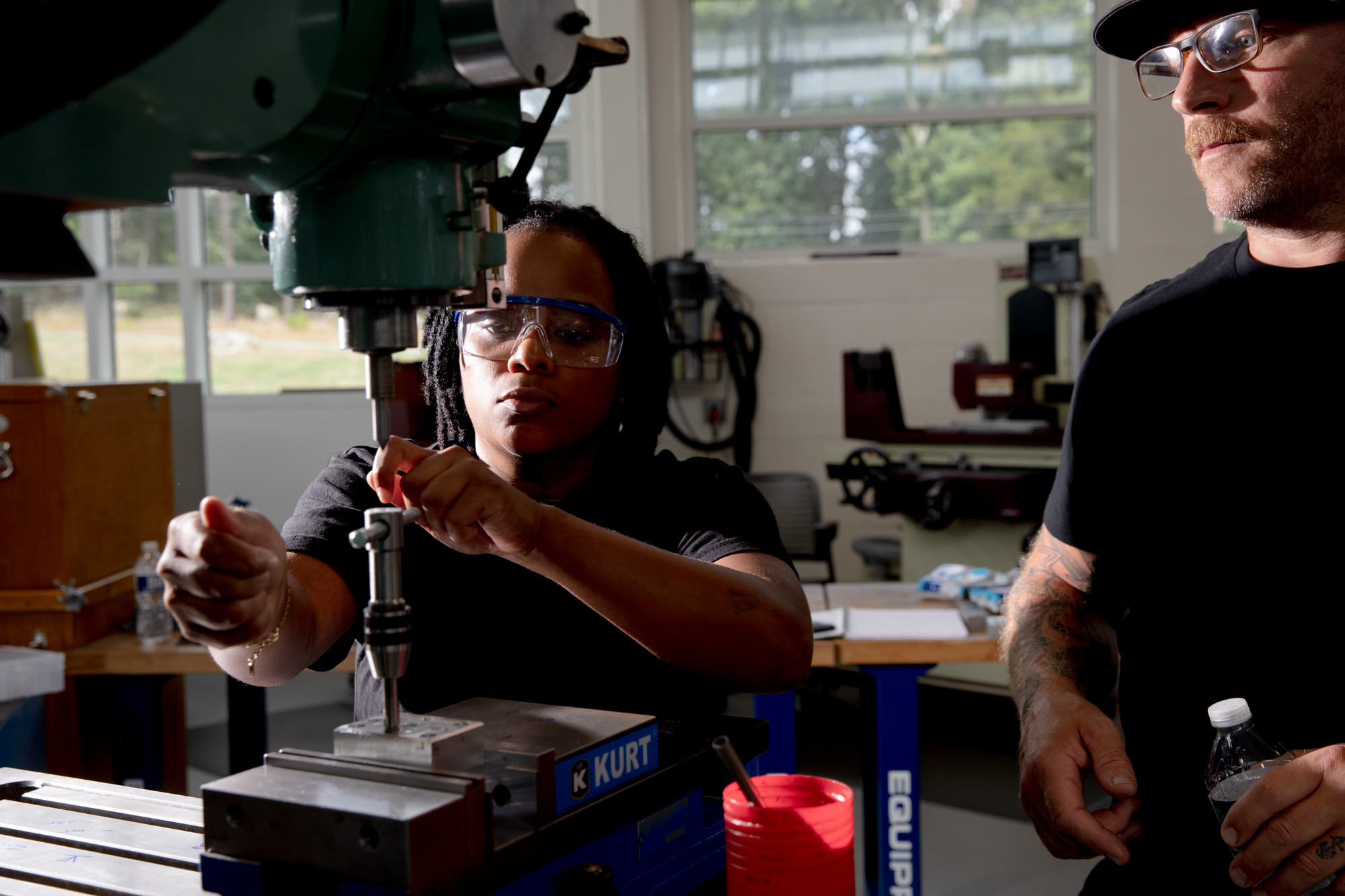 In a brand-new machine shop at Quinebaug Valley Community College in northeastern Connecticut one afternoon this summer, a group of nine adult students — aged 19 to 36 — practiced carefully shaping a small hunk of metal to minute specifications on lathe and milling machines.