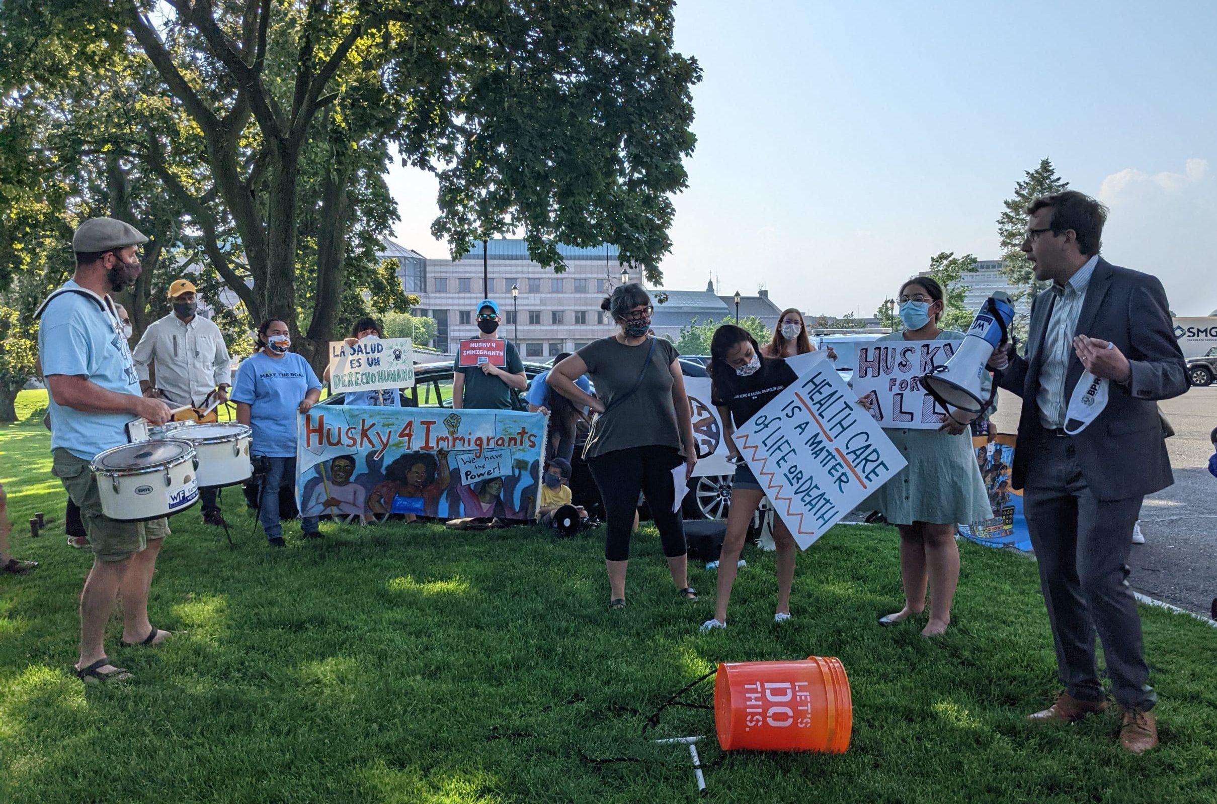 State Sen. Matt Less speaks at one of the daily rallies taking place outside the state Capitol calling on the General Assembly to provide insurance to undocumented immigrants. Credit: Jacqueline Rabe Thomas / CtMirror.org