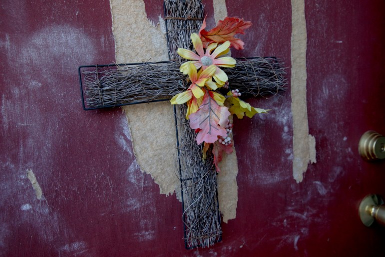 The sink leaks, and the front door is scratched, revealing soft, damp wood underneath the painted surface. They fear the landlord is trying to push people out in order to raise rents, pointing to a recent eviction filed against another member of the union.