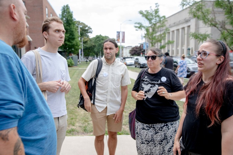 “It’s been hard for me to — at nights — look my children in the eyes, and knowing that there are residents in our town, little kids, your daughter,” he said, gesturing to Kristine Pisani, another union member. “ … to see that she was subjected to that really bothered me.” Pisani is the mother of a toddler and a teenager; the family moved out of the complex last month.
