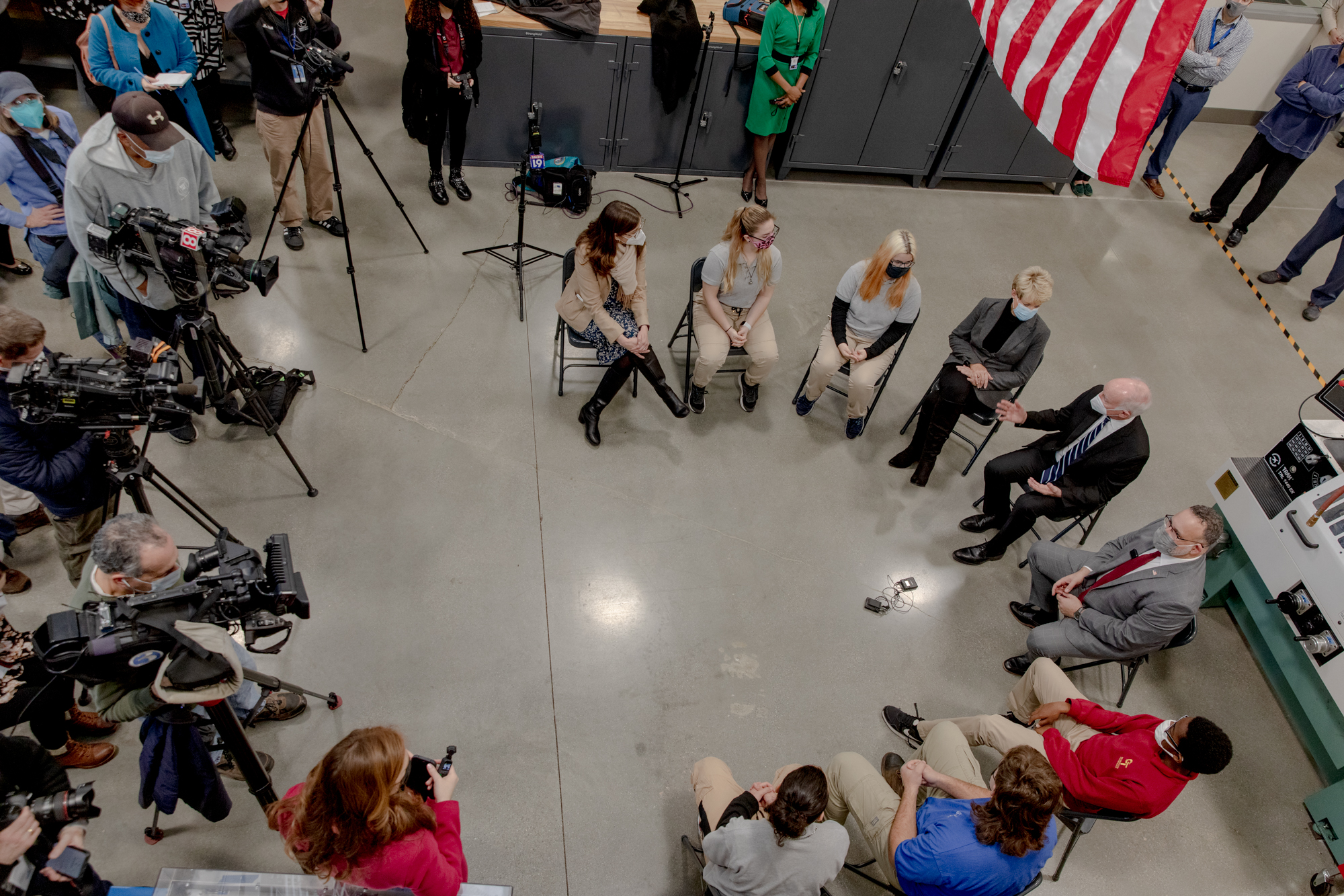 Students have a conversation with Secretary of Education Miguel Cardona and Rep. Joe Courtney, D-2nd at Ella T. Grasso Technical High School. Credit: Yehyun Kim / ctmirror.org