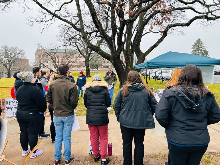 A few dozen people surrounded the organizers, holding signs as a show of solidarity. One sign read, “Unsafe Staffing = Patient Neglect.”