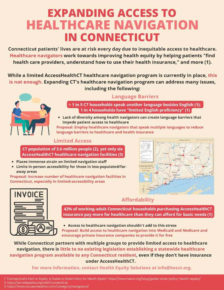 Connecticut patients’ lives are at risk every day due to inequitable access to healthcare. Immediate action to reduce the socioeconomic barriers in front of affordable and equitable healthcare and health insurance is possible through the establishment of a statewide healthcare navigation system, which would provide patients with the resources they need to ensure that every time they go to the doctor’s office or the hospital, they will be receiving the best care possible in a way that will not burden their lives following care.
