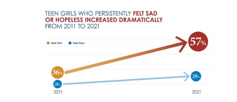 February data from the CDC shows that “mental health challenges, experiences of violence, and suicidal thoughts and behaviors” rose sharply during the pandemic among all teens, but particularly among girls.