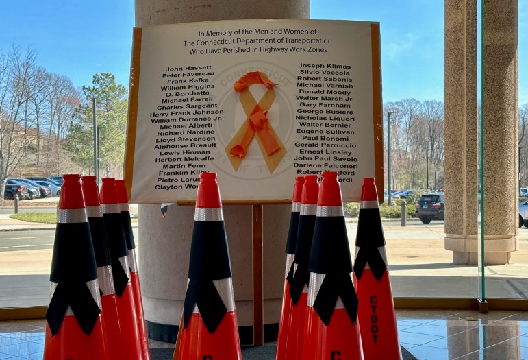 A simple memorial in the DOT lobby lists names of the 13 and 24 other workers killed in work zones. Where someone might ordinarily leave flowers, there are orange traffic cones marked CT DOT and wrapped in black ribbon.
