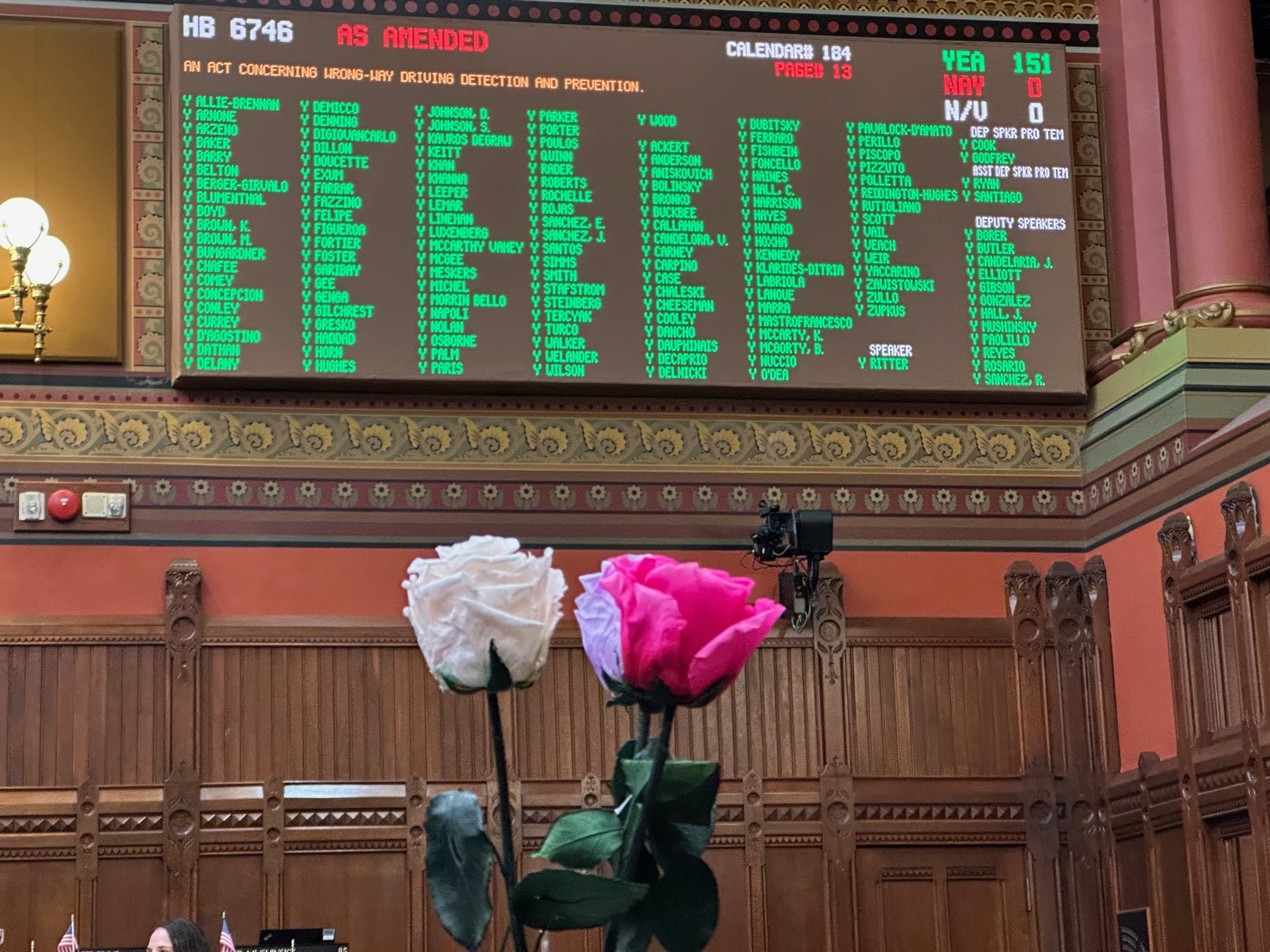 The wrong-way driving bill and flowers that sit on Quentin Williams’s old desk each were a tribute to Williams, the victim of a wrong-way driver accident. Credit: MARK PAZNIOKAS / CTMIRROR.ORG