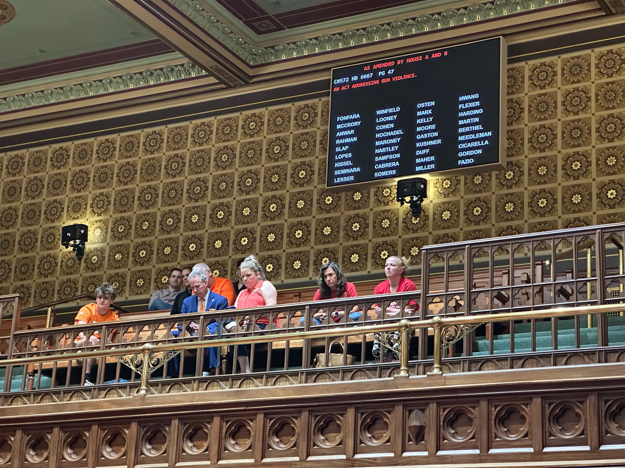 Members of Connecticut Against Gun Violence and Moms Demand Action watch the overnight debate from a largely empty gallery. Credit: MARK PAZNIOKAS / CTMIRROR.ORG