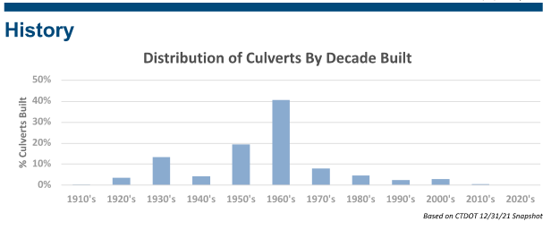 Almost all of the state’s estimated 20,235 culverts were built prior to the 1970s, according to data provided by DOT. The average age of state culverts is 62 years, and the average age of drainage networks is 59 years.