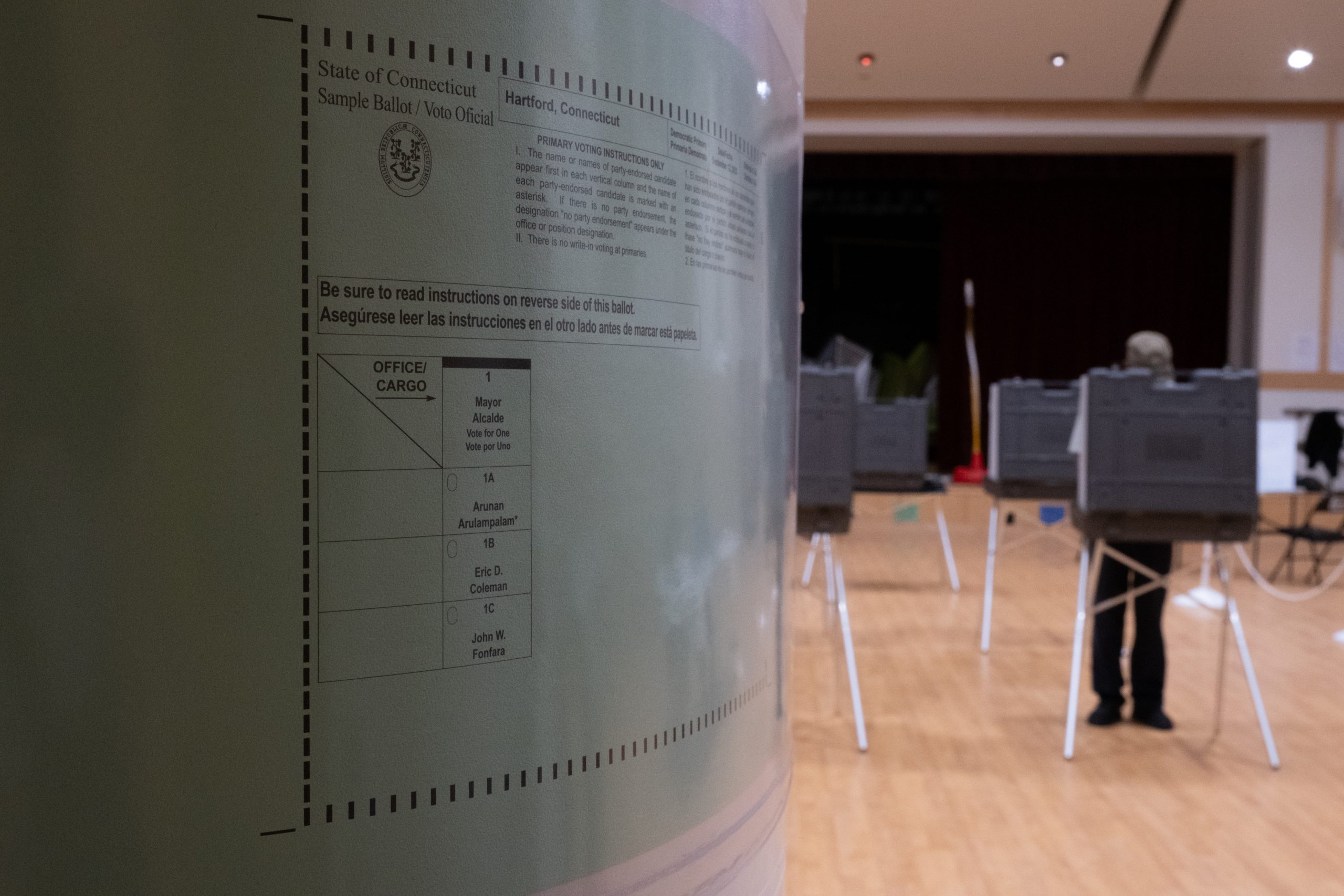 A Hartford resident casts his vote at the Environmental Sciences Magnet School during primary elections. Credit: Shahrzad Rasekh / CT Mirror