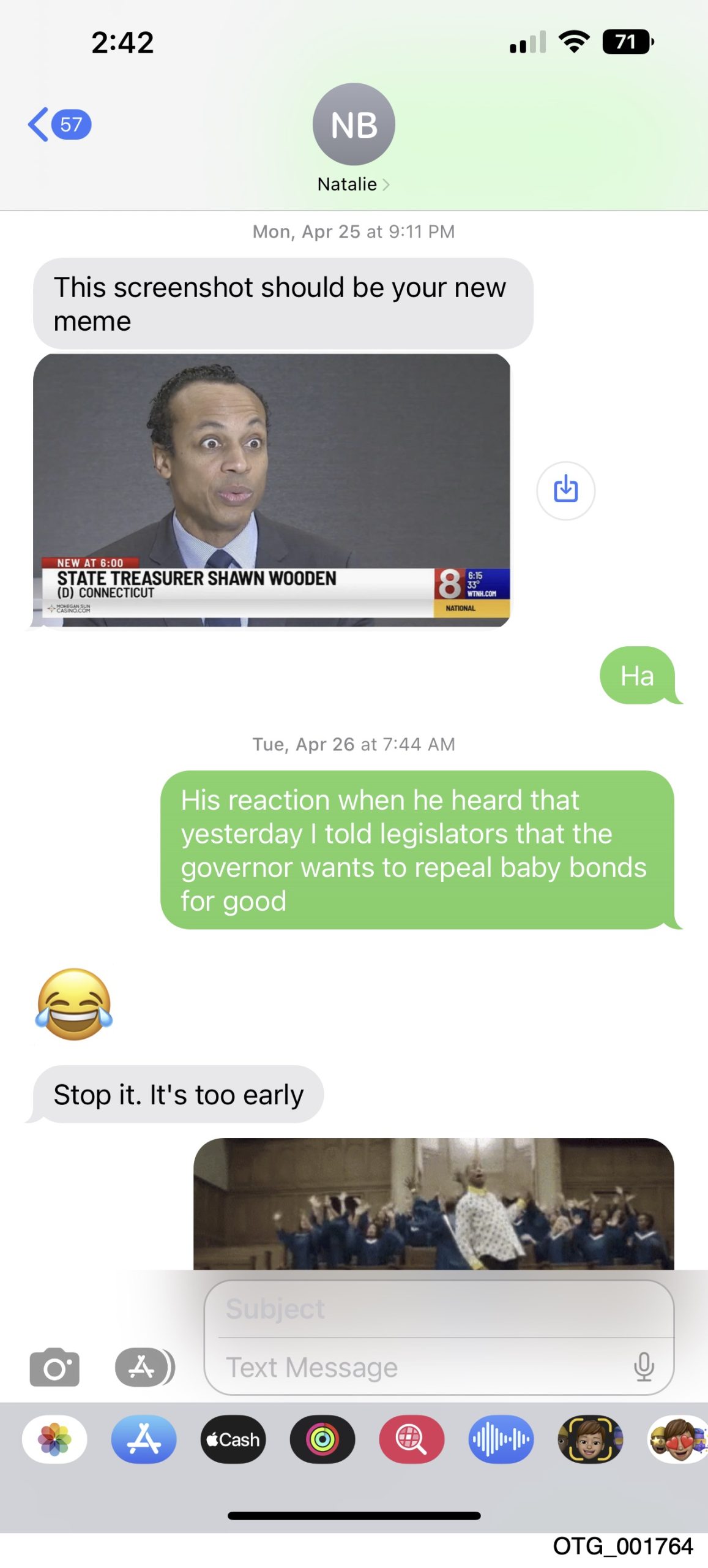Shortly before the program passed, McCaw forwarded a Yahoo Finance article titled “CT State Treasurer on becoming first state to pass baby bonds program.” Mounds responded, “I could care less about him doing bs press.”
