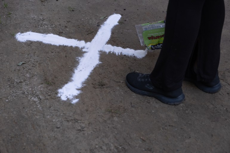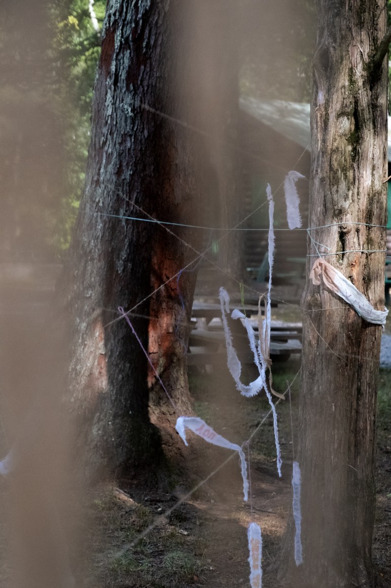 People began to circle the fire. Tevas, bare feet, leather boots, white lace socks, all trod and twirled to the sounds of seven drummers, the ground slightly muddy from the previous day’s rain. Long, white ribbons tied to their fingers swirl through the air, which smelled like a mix of incense and forest dirt. Even little Isaac soared through the air, held up by his father. Onlookers clapped along, some slowly chanting, as the cornmeal veve spread and blended into the soil.