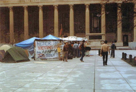Students remained throughout the weekend despite threats of arrest, entertaining each other with musical performances during the day and chanting in protest in the evenings. In 1986, Beinecke Plaza housed a student encampment to protest against apartheid in South Africa.