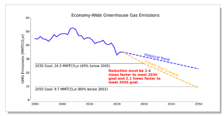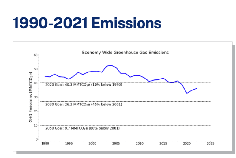 The state did meet its 2020 mandate to reduce economy-wide GHG emissions 10% from 1990 levels. But it has been backsliding since then and is way off target to meet its next metric – 45% below 2001 levels by 2030.
