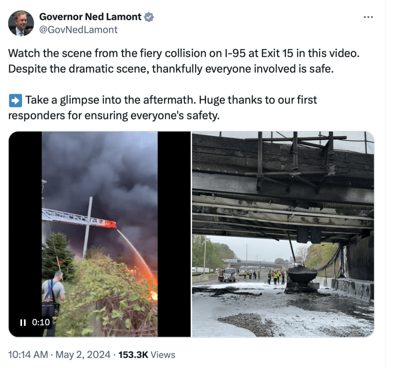 “The heat from the burning fuel compromised some of the bridge. So that bridge is going to have to come down,” Lamont said. “That could probably take 24 hours, or a little longer than that. Then they’re going to have to take a second look at repaving to make sure the road is safe and secure.”