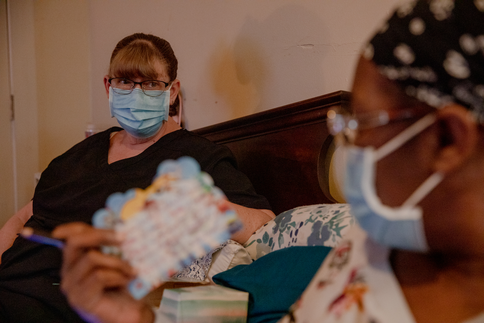 Kimberly Roberts, 54, listens to what she needs to purchase for Brenda Moore's grandchild's baby shower. "Without HUSKY C, I can't afford that," Moore said of having Roberts as a personal care aide at her home. "And if I can't afford that, I think about other people." Credit: Yehyun Kim / CT Mirror