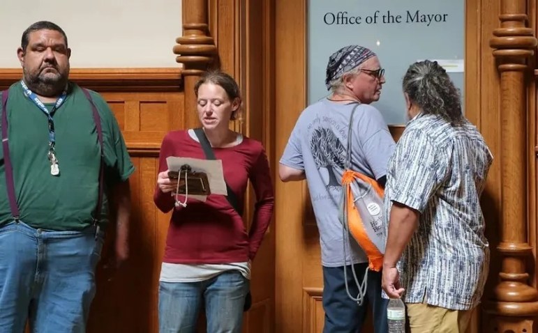 Outside, Mark Colville, holding the cease-and-desist letter, mobilized the residents to City Hall, where they would return the letter, alongside a copy of their statement.