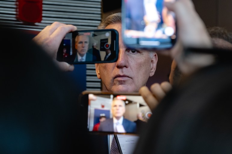 Former U.S. House of Representatives speaker Kevin McCarthy answers questions from delegates at the 2024 RNC convention. Credit: Shahrzad Rasekh / CT Mirror
