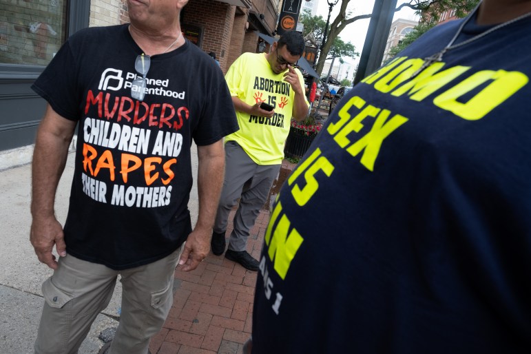 Just outside of the convention perimeter, David Grisham of Amarillo, Texas speaks to a fellow open-air preacher. Credit: Shahrzad Rasekh / CT Mirror