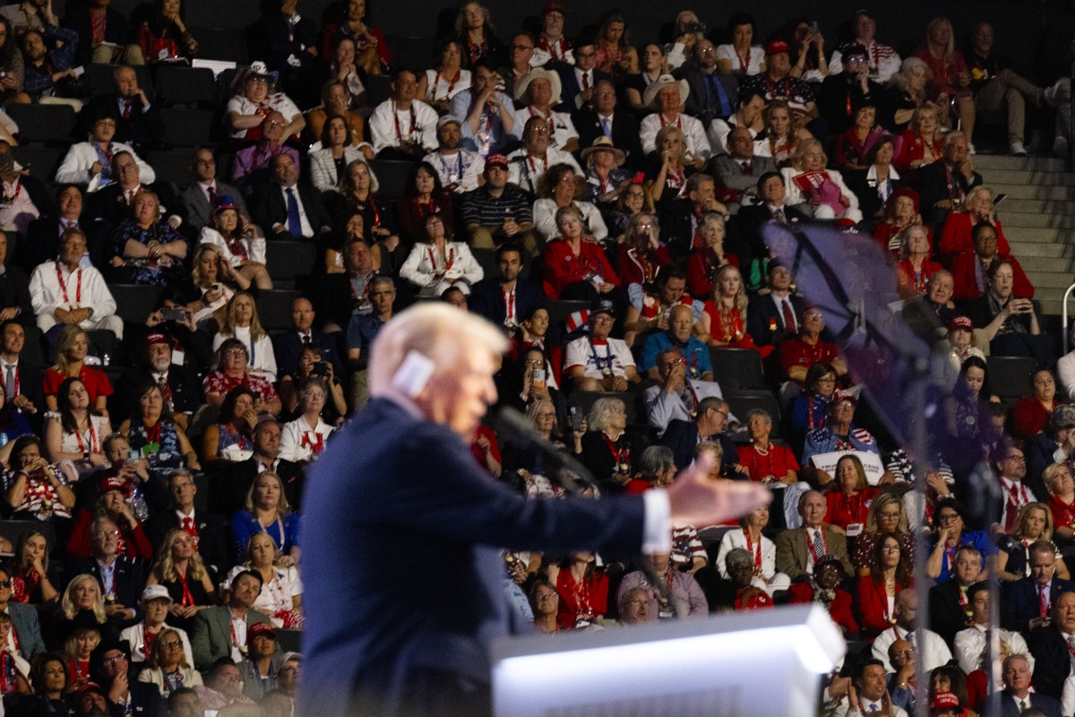 Former president Donald Trump greets attendees of the RNC convention on its third day. Credit: Shahrzad Rasekh / CT Mirror