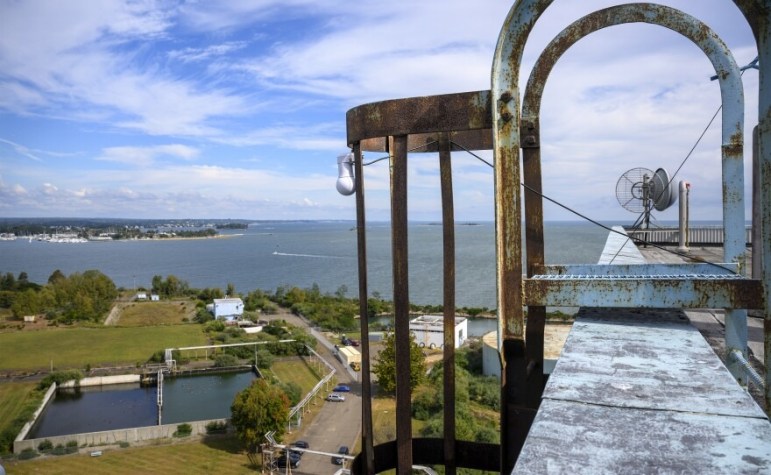 Norwalk resident Allison McChord is gripping onto a pole while riding inside an ATV behind her husband, Austin McChord, as they take in the sights of a former power plant on Manresa Island.