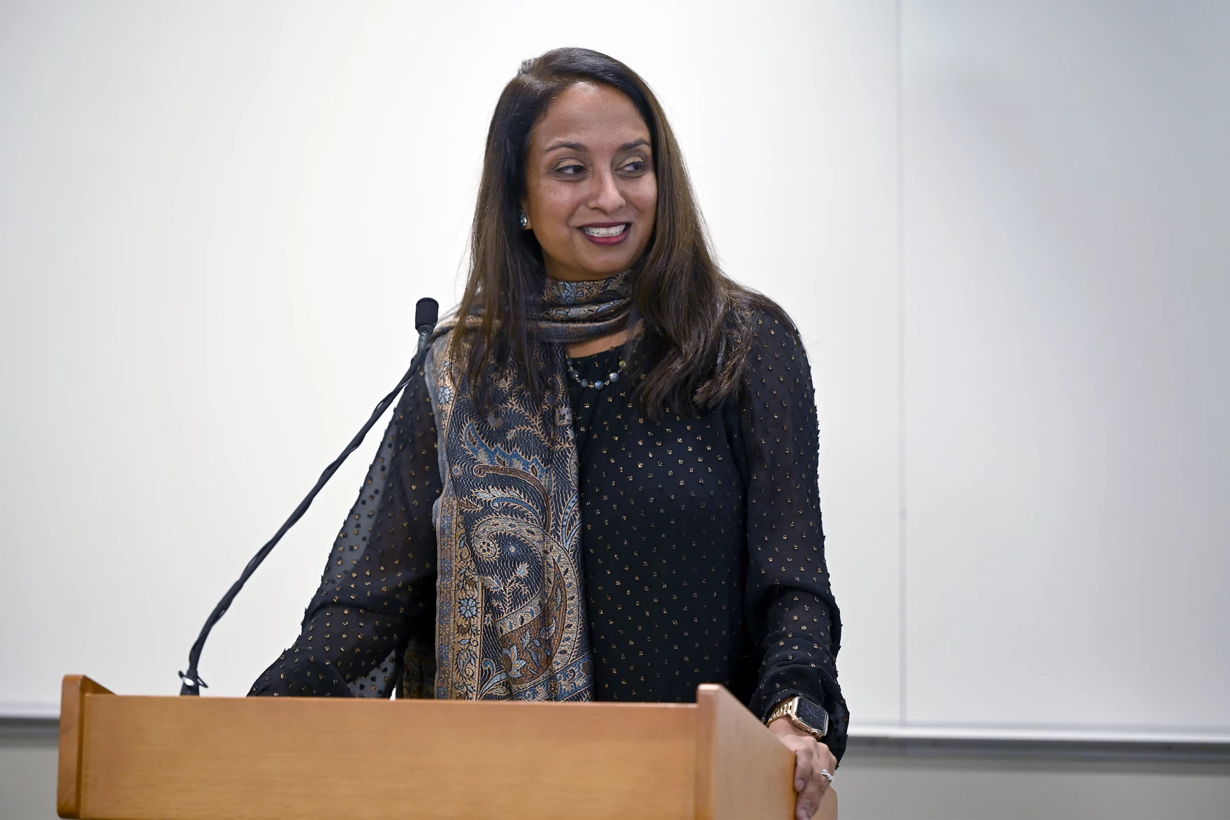 Connecticut Public Health Commissioner Dr. Manisha Juthani, answers questions as Gov. Ned Lamont and school officials announced the rollout of the Screen and Stay initiative for Connecticut schools that choose to participate at Newington High School on Nov. 4, 2021, in Newington, Connecticut. Credit: Joe Amon / CT Public