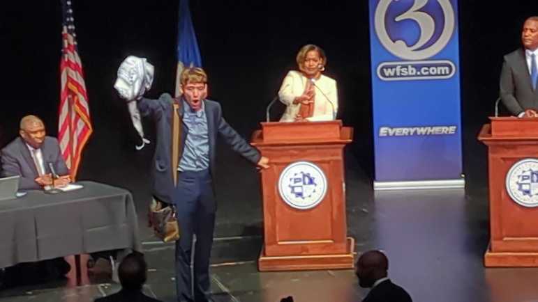 While fielding a question about America’s role in the conflict roiling the Middle East, a protester interrupted Hayes’ response from the stage. Holding a keffiyeh, the protester shouted “[Israeli Prime Minister Benjamin] Netanyahu doesn’t care about the hostages” and chanted “Free Palestine” as a police officer escorted him off the stage and arrested him. After the protester’s removal, the debate resumed.