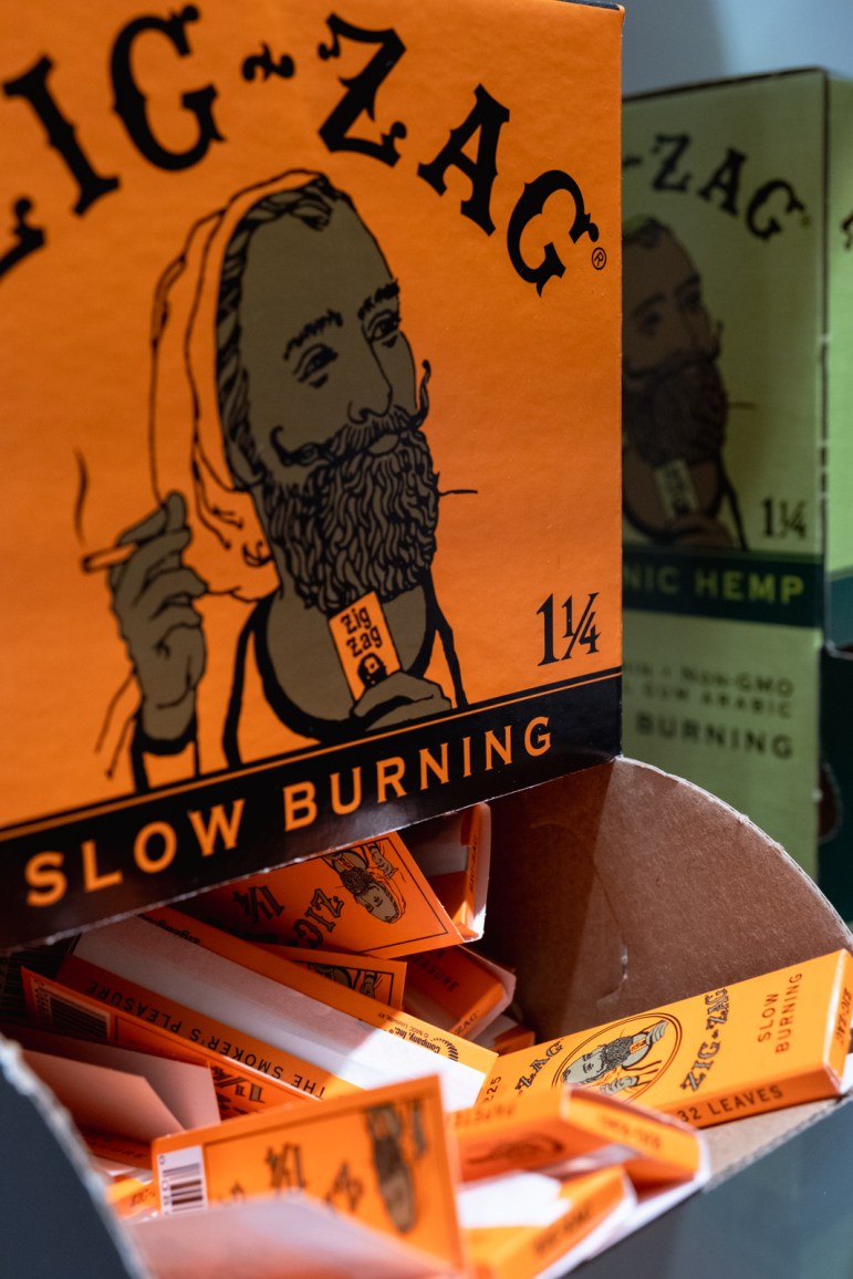 Fine Fettle, a chain of cannabis retailers with locations in Connecticut, Massachusetts and Georgia, has a glass display case in the lobby of its West Springfield, Mass. shop, where dozens of products with distinctive branding — names like Fruit Stiq, Papa’s Herb, Holiday and Liquid Diamonds — are available to peruse. On the opposite wall is a 4-foot tall replica of a canister of Baby Teeter brand blueberry infused pre-rolled joints. The shop, featuring a bright orange sign, is easy to find just across the Connecticut River from downtown Springfield, in a big-box shopping complex where it shares a parking lot with Chipotle, T.J. Maxx and other national retailers.