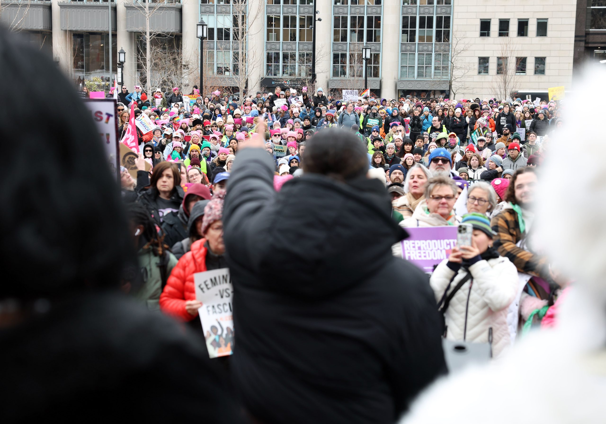 The crowd listens to Aisha Becker-Burrowes, co-founder and executive director of Feminist, at Franklin Park before the People’s March begins in Washington, D.C., on Saturday, Jan. 18., 2025. Credit: Shahrzad Rasekh / CT Mirror
