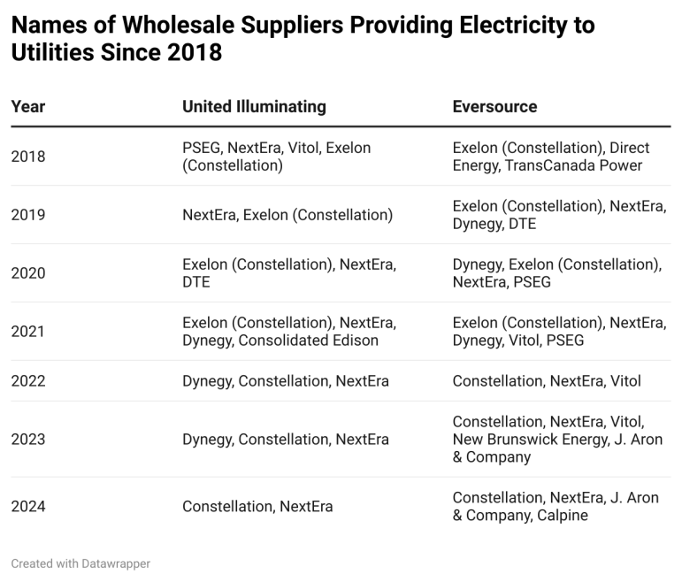 Who are these wholesale suppliers? Eversource and United Illuminating are legally obliged to reveal the identities of the winning suppliers after each round of electricity purchasing is finished. The table below provides all of the disclosed names of wholesale suppliers that I was able to find in the public record since 2018.