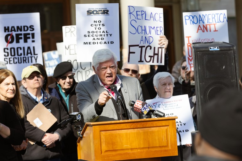 Democrats rallied outside the state Capitol in Hartford on Tuesday in a coordinated national “day of action” aimed at heading off what they say are inevitable cuts to Medicaid as the Trump administration and Republicans move to extend provisions of the 2017 tax cut law.
