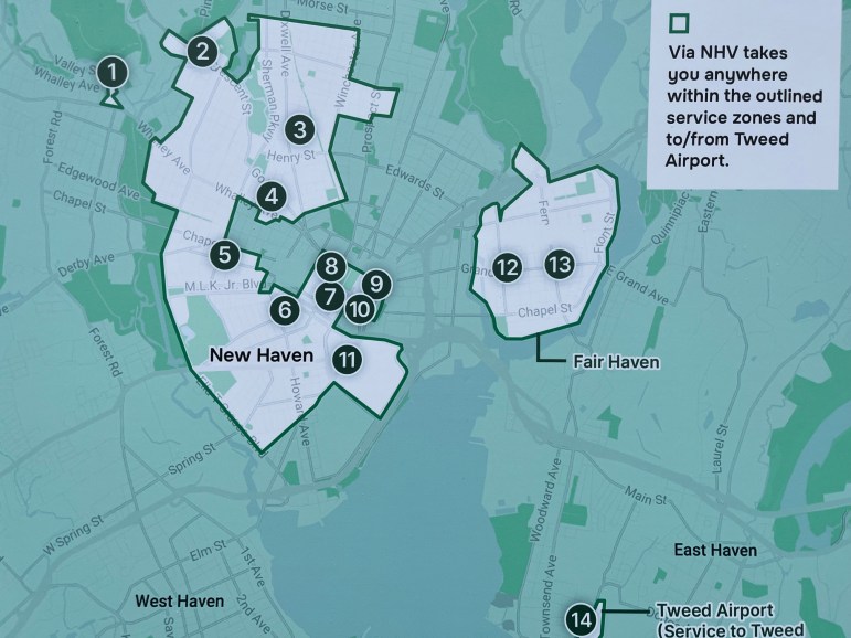 In New Haven, the Via NHV pilot is mostly limited to customers in two zones located on the city’s west side, downtown and Fair Haven neighborhoods between 7:00 a.m. and 7:00 p.m. Officials said those zones were drawn to correspond to areas where fewer residents have access to cars.