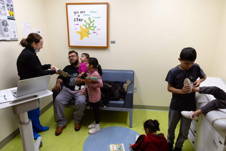 The kids explored the beds, the walls, the medical supplies, as two nurses examined them one by one. Everyone remarked on the large family — so many kids! Madina stayed at home, resting before her prenatal appointment later in the day. Asra, the 3-year-old, smiled through a hearing test. And somehow Alia, 6, smiled through her blood draw.