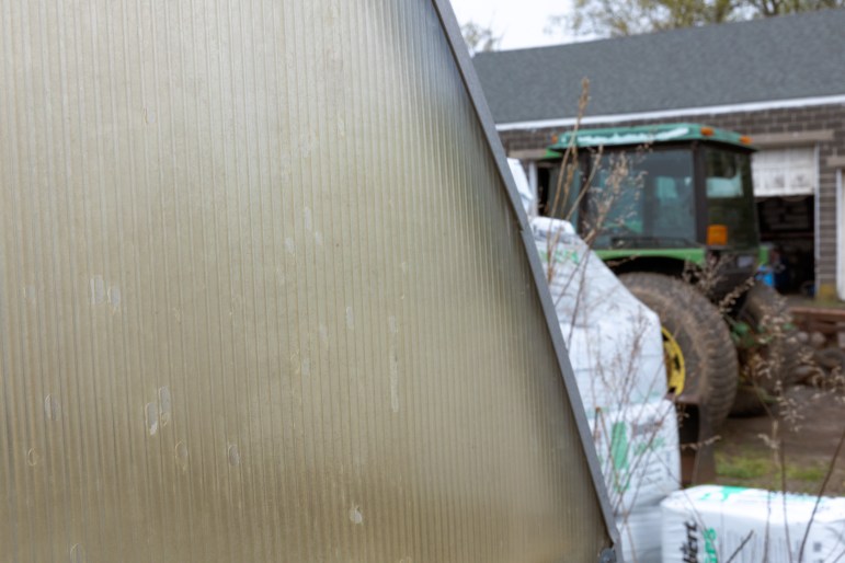 There are reminders of the 13-minute hail storm that hit last August all around the farm — including dents in buildings, the greenhouses and the sign that sits at the edge of the road. Dellacamera farms on a total of 120 acres in the area.