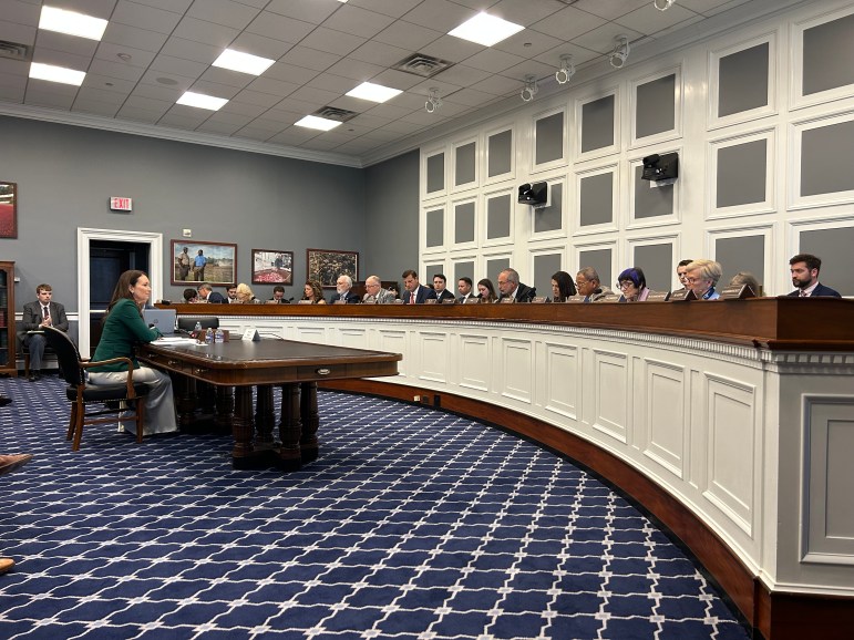 Her first stop was at a Senate appropriations subcommittee on Tuesday. About 20 people watched her testimony from the wood-paneled hearing room. Dellacamera took a seat behind her a few rows back and was visible in the livestream.