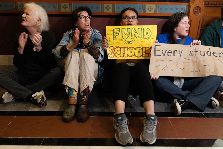 The apprehensions took place in the wake of a rally, organized by the state’s chapter of the American Federation of Teachers union. For over an hour Wednesday afternoon, chants of “Fund our schools!” echoed within and outside the building as dozens of union members, students and other community leaders called on the governor and lawmakers to increase assistance for school districts and boost support for growing special education costs.