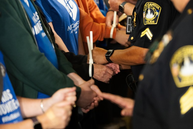Then Blatteau and nine other educators and students sat down outside the governor’s office, blocking the doors. After ignoring requests to leave the premises and threats of arrest for disorderly conduct from Capitol police officers, the ten individuals were placed in flex cuffs and escorted outside. They were met with cheers and chants from the crowd there as they were charged.