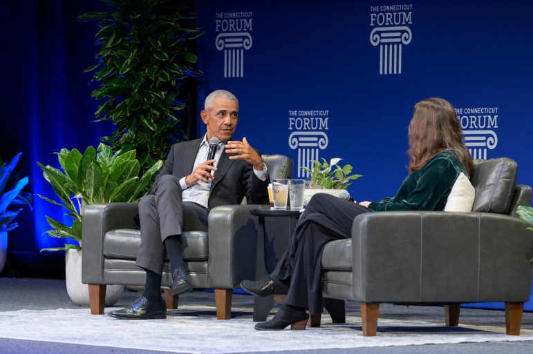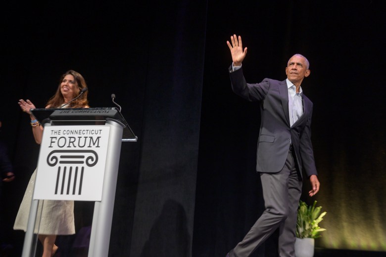 Obama was not there to answer alarms sounded on social media and amplified by Leibovich. He was honoring a booking with a venerable venue for thinkers and artists, the Connecticut Forum. The 44th president of the United States arrived in crisp charcoal slacks, white shirt open at the collar and a dark blazer. There was neither cape nor cowl.