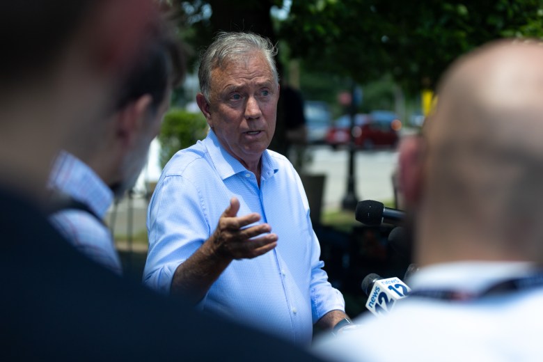 Gov. Ned Lamont, at a press conference announcing a transit-oriented development project at New Haven's Union Station, cautioned against reading too much into Zohran Mamdani's upset victory in the New York mayoral primary. Credit: Dana Edwards / CT Mirror