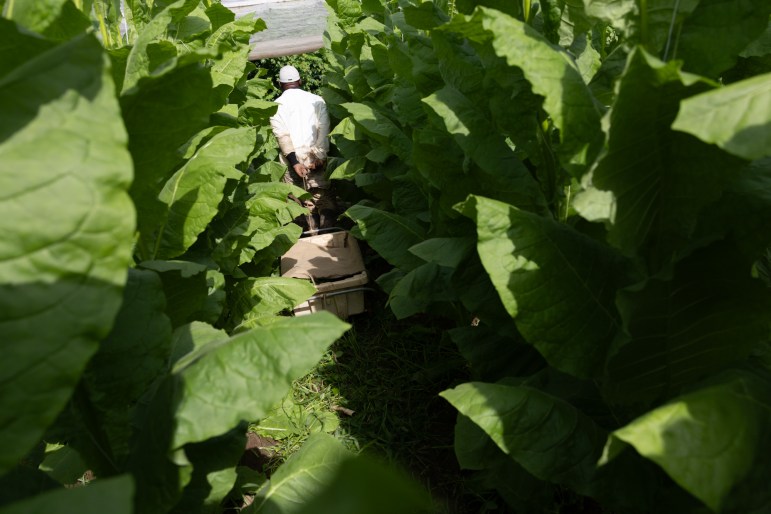 There’s Jackson, who has picked tobacco for 40 years. Henry, who is wearing a homemade contraption that looks like a large reverse fanny pack to protect himself as he slides along the ground, has been picking for over 30 years. Arnold makes sure to check on a teenage boy who just started picking a day earlier.
