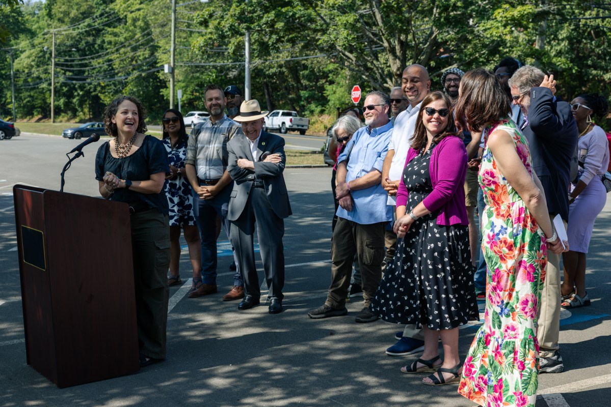Berger-Girvalo and other officials gathered in Hamden, across the street from the Seramonte Apartments where tenants reported excessive, predatory towing. The towing practices have since stopped at Seramonte, but the renters’ complaints sparked larger conversations about towing statewide.