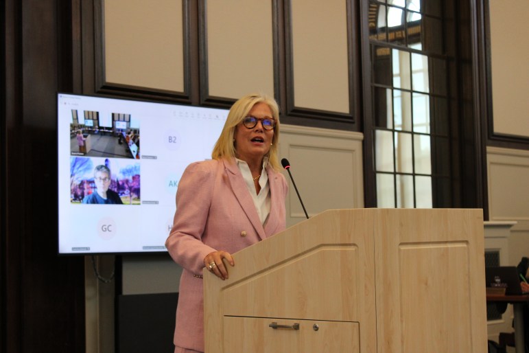 Sen. Heather Somers, R-Groton, speaks at a UConn Board of Trustees meeting on September 17, 2025. Somers was one of several lawmakers from the region who urged the board to expand academic programs and housing at the university’s Groton-based campus. Credit: Emilia Otte/CT Mirror.