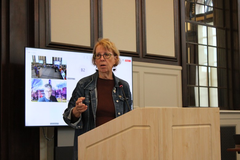 Sen. Cathy Osten, D-Sprague, speaks at a Board of Trustees meeting on Wednesday, September 17, 2025. Osten was one of several lawmakers from the region who urged the board to expand academic programs and housing at the university's Groton-based campus. Credit: Emilia Otte/CT Mirror