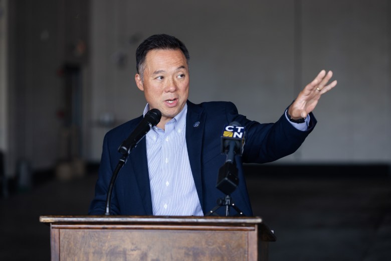 Attorney General William Tong speaks at a press conference in Stamford on July 16, 2025 to announce a lawsuit against the Trump administration's hold on federal FEMA funding that will impact a number of Connecticut projects. Credit: Shahrzad Rasekh / CT Mirror
