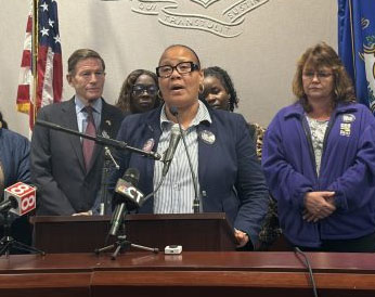 During a press conference at the state Capitol, Keisha Gartman, a registered nurse, criticizes a proposal by the Trump administration that would limit federal student loan assistant to nurses pursuing graduate degrees. Credit: Katy Golvala / CT Mirror