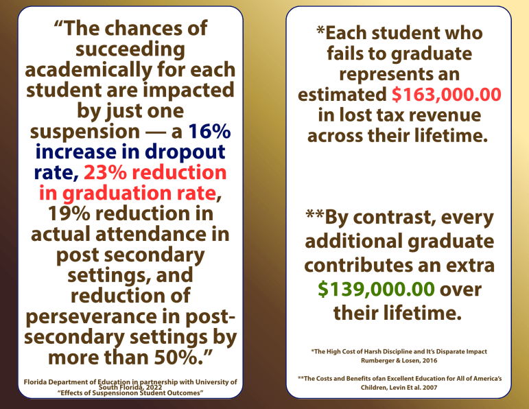 School suspension is one of the strongest predictors of dropping out, reinforcing a cycle of poverty that strains public resources. High school dropouts face higher unemployment rates and are more likely to rely on public assistance, costing taxpayers billions over their lifetimes. Each student who fails to graduate represents an estimated $163,000 in lost tax revenue across their lifetime. By contrast, every additional graduate contributes an extra $139,000 over their lifetime. Keeping students in school is not just an educational priority; it is a sound economic investment.