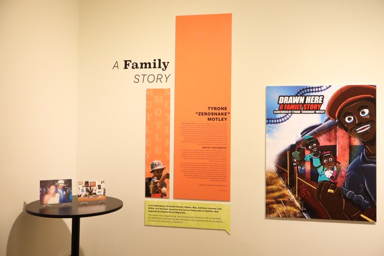 The exhibition, which is on the main floor of the museum, covers the walls with the five fictional stories that combine the current realities of North End residents with important historical figures, migration patterns and events that shaped the neighborhood’s history and that of Hartford.