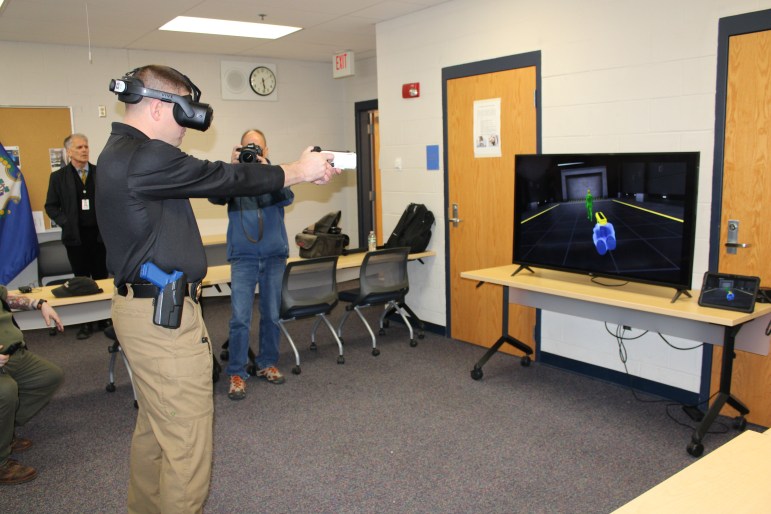 The virtual reality software allows troopers to practice shooting at both standing and moving targets. It also places them in lifelike scenarios — for example, a traffic stop in which the person in the car pulls out a knife.