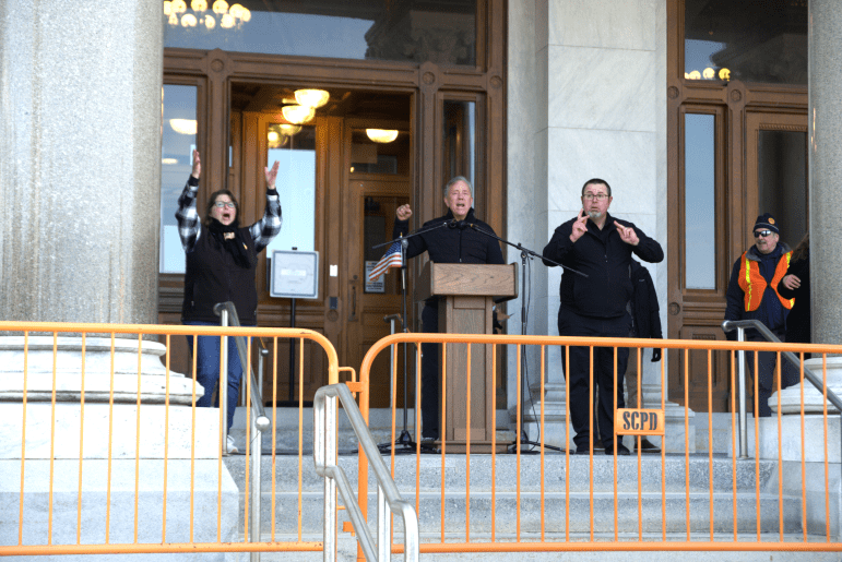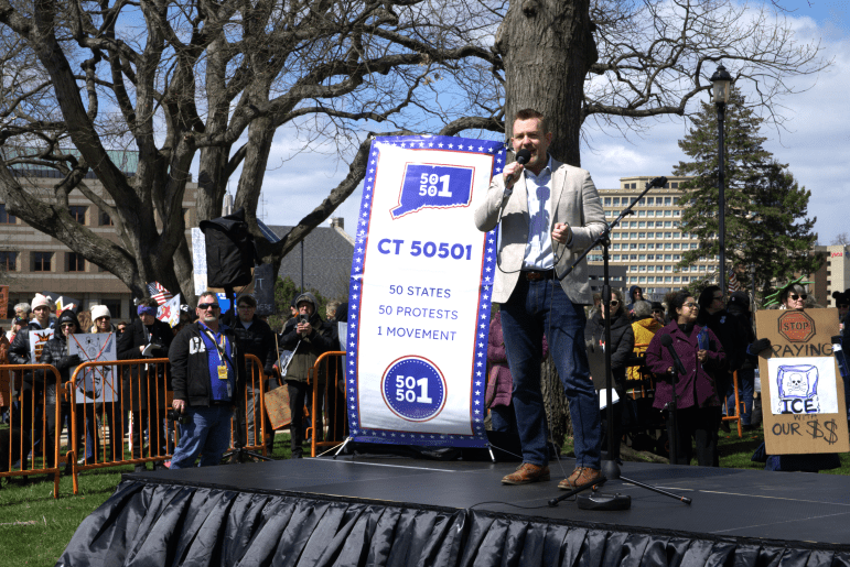 Sen. Richard Blumenthal, D-Conn., Attorney General William Tong and Gov. Ned Lamont spoke at a protest organized by Indivisible CT on Saturday morning. In the afternoon, more protesters gathered on the opposite side of the Capitol, where Rep. Josh Elliott, D-Hamden, who is challenging Lamont for the Democratic nomination for governor, spoke alongside labor leaders and representatives for the Connecticut for All Coalition.
