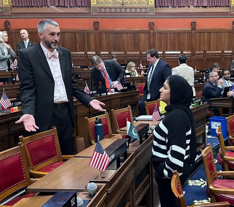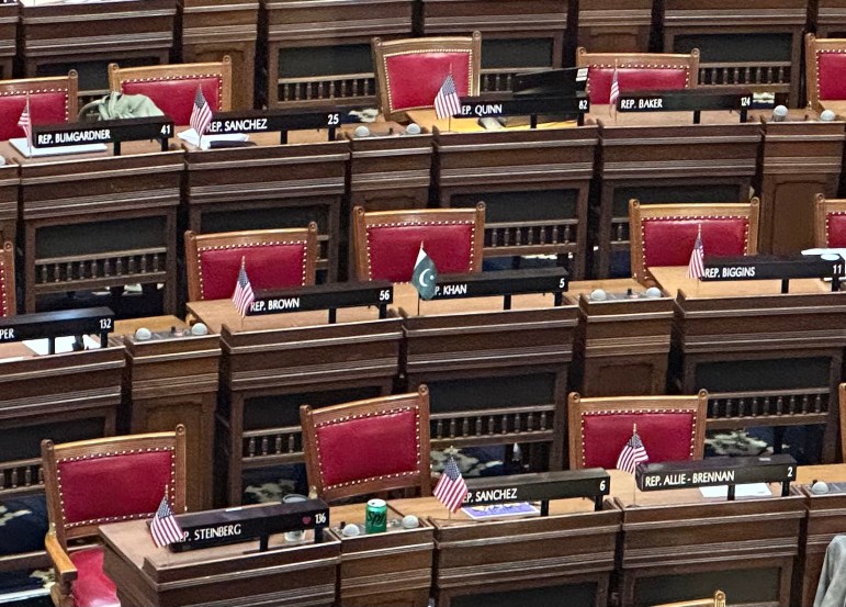 House Minority Leader Vincent J. Candelora, R-North Branford, confirmed that the Gadsden flag and at least one Israeli flag displayed Monday after the House returned from a week’s recess were directed at Khan’s flag and what the GOP saw as an uneven enforcement of rules barring political displays.